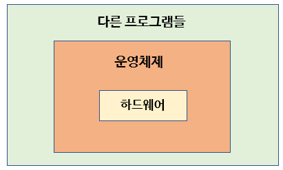 위 그림과 같이 운영체제는 하드웨어를 감추고 겉으로 다른 프로그램들을 지원해준다고 생각할 수 있다. 하드웨어를 감춘다는 것은 프로그램을 사용하는 사람이 편하게 쓸 수 있게 각종 기반 작업을 지원한다고 이해하면 된다.
